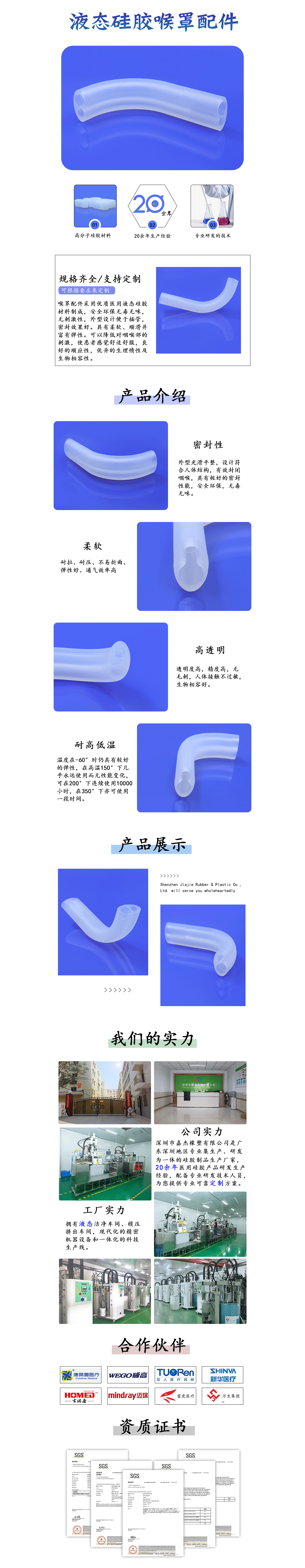 液態(tài)硅膠喉罩配件性能: 1.透明,耐高低溫; 2.經(jīng)久耐用,不變形; 3.安全、環(huán)保、無(wú)毒放心使用; 4.采用食品級(jí)硅膠材質(zhì),硅膠醫(yī)療配件; 液態(tài)硅膠喉罩配件用途 適用于醫(yī)用硅膠制品、醫(yī)療硅膠配件、定制各種醫(yī)療用品雜件。